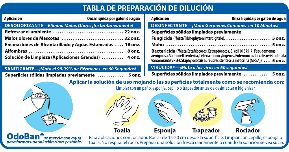 OdoBan® is our multi-purpose, concentrated formula. OdoBan® cleans, disinfects, sanitizes, freshens and eliminates odors. Beloved by fans everywhere, this concentrate is economical and versatile. Leaves no residue. One gallon of product makes up to 32 gallons. View handy dilution chart. Made in USA.